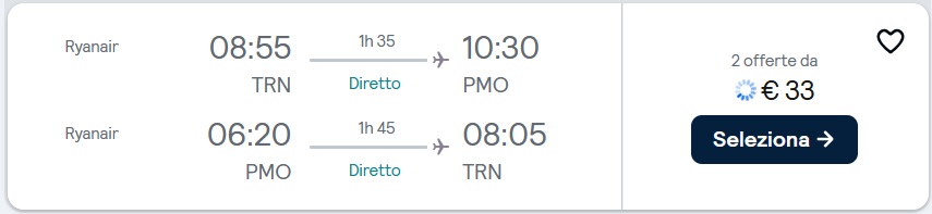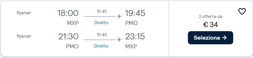 Goditi il sole e la cultura della Sicilia con dei voli low cost da Milano e Torino. Puoi viaggiare da Malpensa, Bergamo e Caselle a Palermo con Ryanair a partire da 33 € andata e ritorno con bagaglio a mano piccolo incluso. 🛫✨